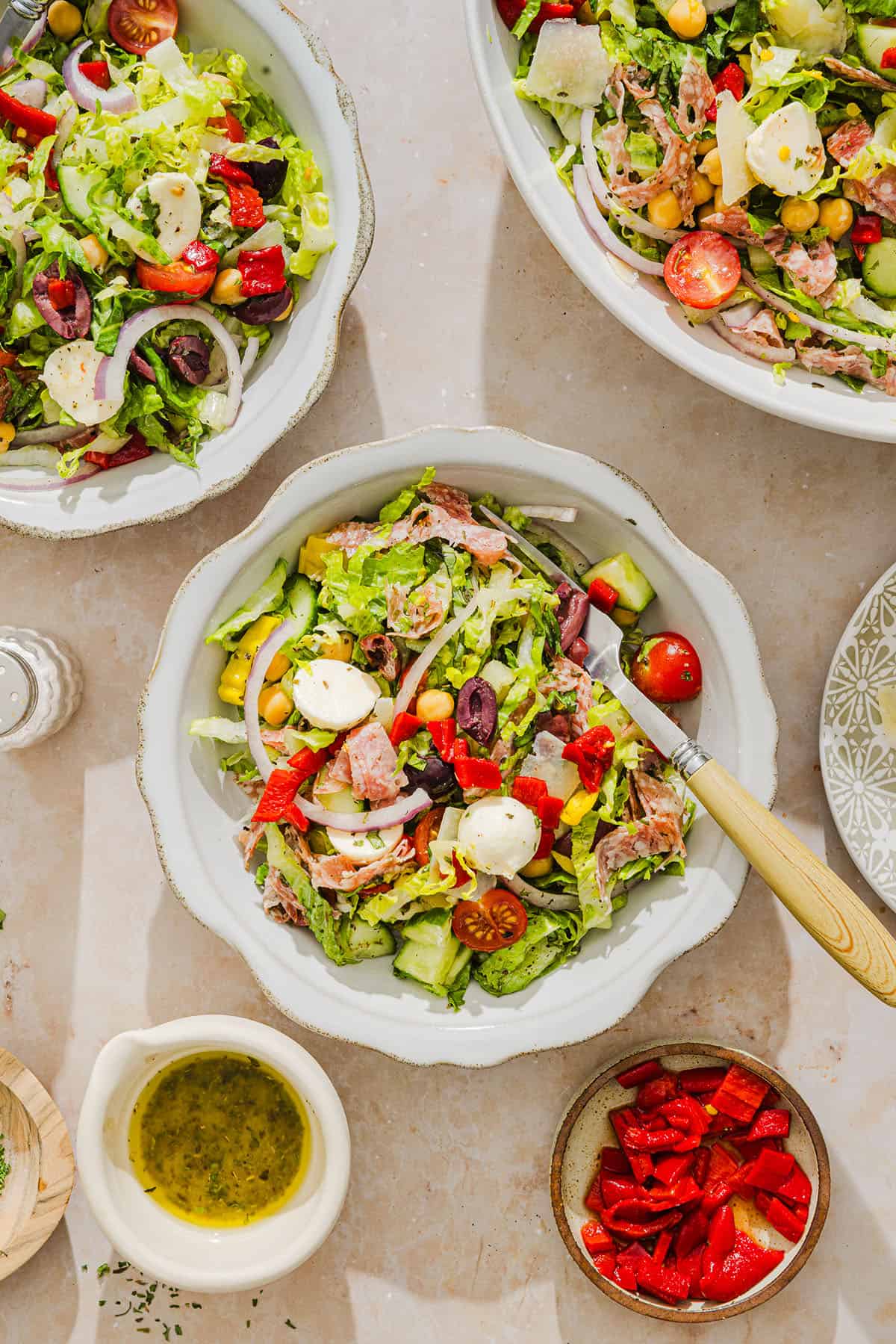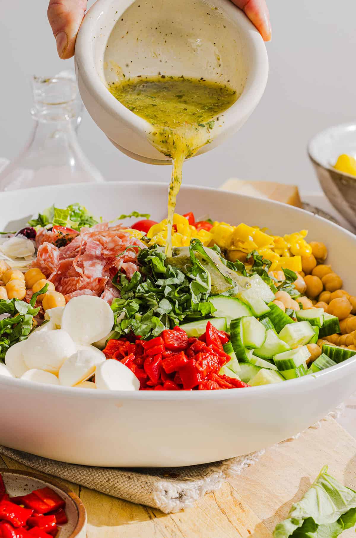 1. Chop everything finely. The key to this salad is chopping everything into small, bite-sized pieces. This way you get a little bit of everything in each bite! Slice the tomatoes, cucumbers, red onion and mozzarella balls. Next, roughly chop the lettuce, roasted red peppers, salami, pepperoncini, olives and fresh basil. Try using this vegetable chopper to save on time and chop everything the same size.
