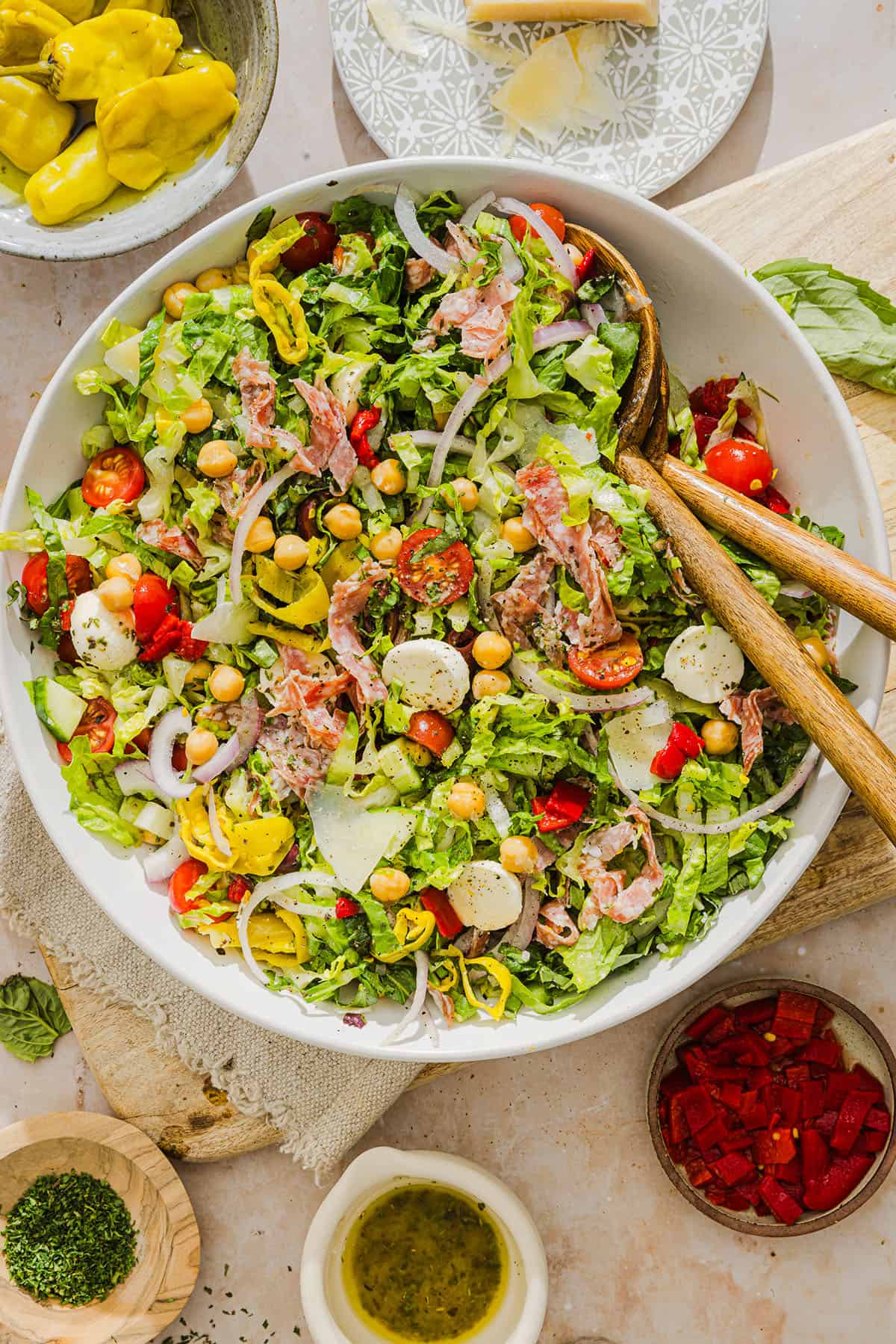 This Italian Chopped Salad tastes just like your favorite grinder, but lighter and SO good! Loaded with crisp lettuce, savory salami, chickpeas, fresh veggies and the best homemade dressing, all chopped up so you get the perfect bite every time!