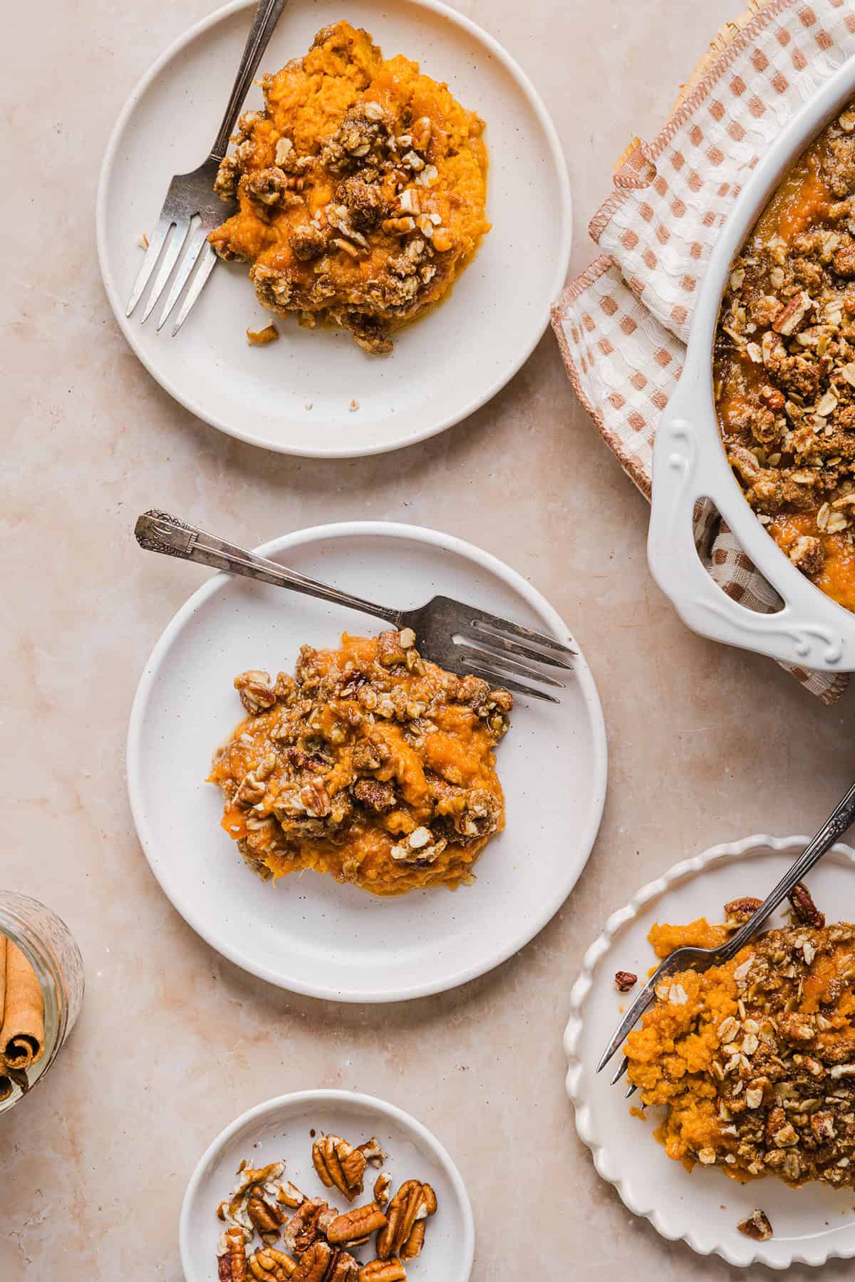 This Healthy Sweet Potato Casserole might be my family’s favorite Thanksgiving side dish! Creamy, comforting and spiced to perfection with cinnamon and nutmeg. Traditional sweet potato casserole is often loaded with butter, sugar and marshmallows, but we have lightened this recipe up using maple syrup as a natural sweetener along with a crunchy oat pecan topping.