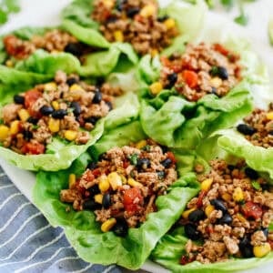 When making lettuce wraps, I like to use either butter lettuce, Bibb or Boston lettuce leaves because they are less watery than romaine yet still crisp and have a really great taste. They also are the perfect shape to hold all your filling which makes eating these tacos easy! Then you can have fun with all your toppings! Feel free to add a little cheese, additional salsa, avocado, sour cream, chopped onions…I mean the possibilities are endless. You could also top your tacos with this yummy avocado cremá that I made for these cilantro lime chicken tacos! Another really good recipe I love.